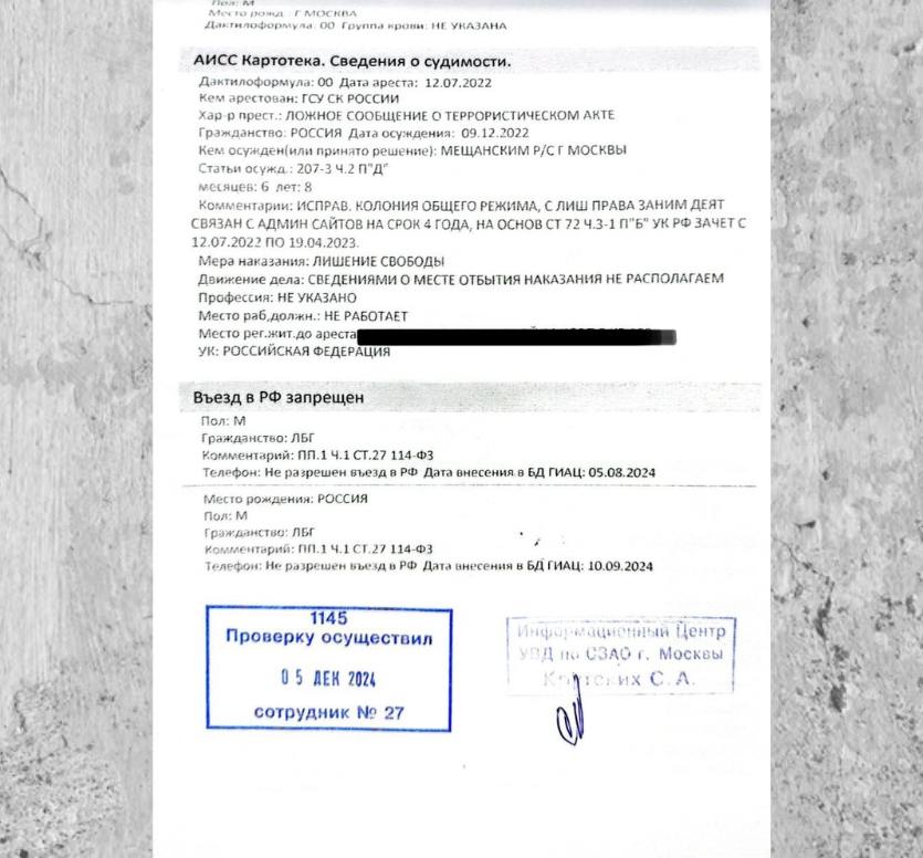 В выписке из базы МВД указано, что Яшину запрещен въезд «в целях обеспечения обороноспособности или безопасности государства». Как отмечает «Медиазона»*, такой запрет можно наложить только на иностранца или человека без гражданства, так как в законе написано, что гражданину России ни при каких условиях нельзя запретить вернуться в страну.