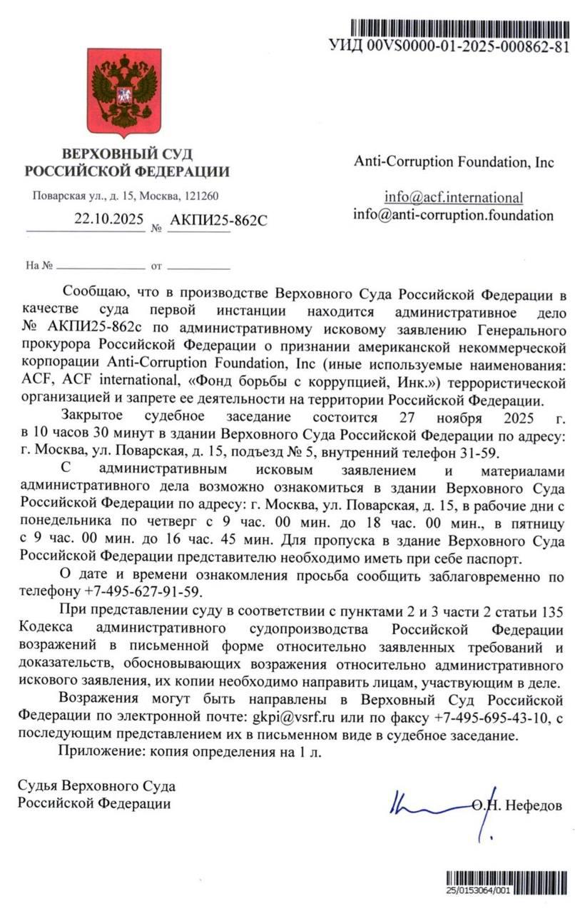 The Prosecutor General's Office of Russia filed a lawsuit to recognize the American legal entity ACF Inc (Anti-Corruption Foundation) as a terrorist organization. The hearing is scheduled for November 27 and will be held in a closed session. The court ruling was published by Leonid Volkov**.