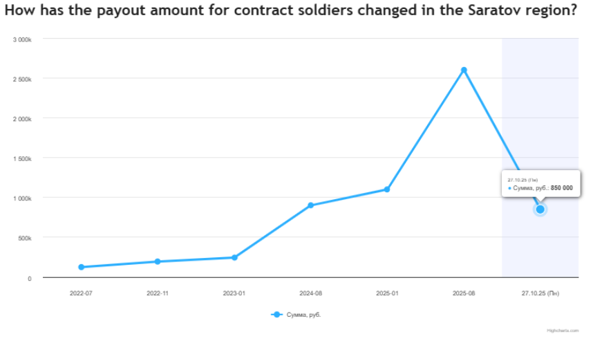 По подсчетам «Важных историй»**, выплаты для вербовщиков к октябрю 2025 года были в каждом третьем регионе. Из них 11 регионов указали траты на поощрение рекрутеров в отчетах об исполнении региональных бюджетов. Саратовская область оказалась лидером по совокупному размеру за все время существования выплаты — на это потратили порядка 400 миллионов рублей из резервного фонда региона, столько же было потрачено на строительство в рамках программы расселения аварийного жилья.